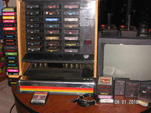 About 10 years ago I was taking out some trash for a job I was at and saw an interesting thing poking out of a nearby dumpster. I went to take a look and say that it was an old Imagic store display that let’s you choose a game locked in a case to play in the store. I took it home and found that it didn’t work. I took off the back and after examining it found that the power connection had come loose. I fixed that plugged it in again and it worked! I was excited and thought what can I do with this since I didn’t have an Atari system anymore. I decided to go find one and fix it up for a mothers day present (my mom loved to play those games with my brothers and me).