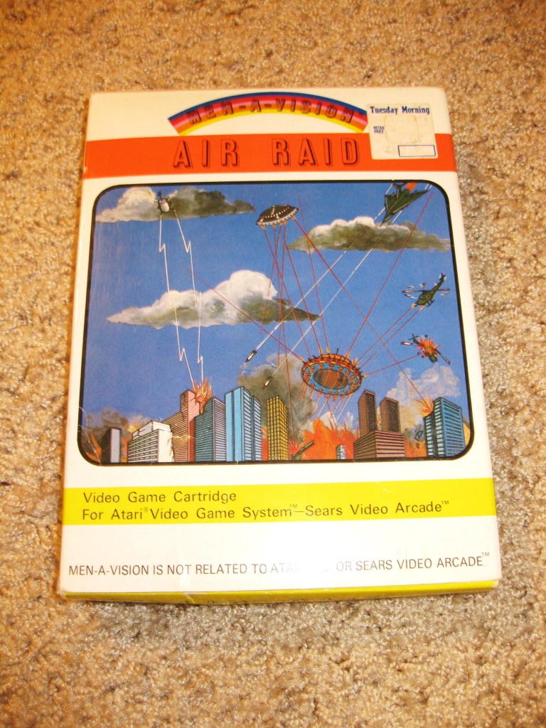 I clearly remember buying this game back in 1984 or 1985. My mother had taken me to a Tuesday Morning store in Arlington Texas. It was near the corner of Arkansas Lane and Medline Drive. Not too long after I purchased it, I got an Atari 800 and stopped playing the 2600. Since then,the Air Raid cartridge has been boxed up in my garage along with my 2600 and other games for over 20 years. The game box was stored separately and I just found it. I had no idea that I still had these game boxes. I can send you a picture of the other boxes upon request.